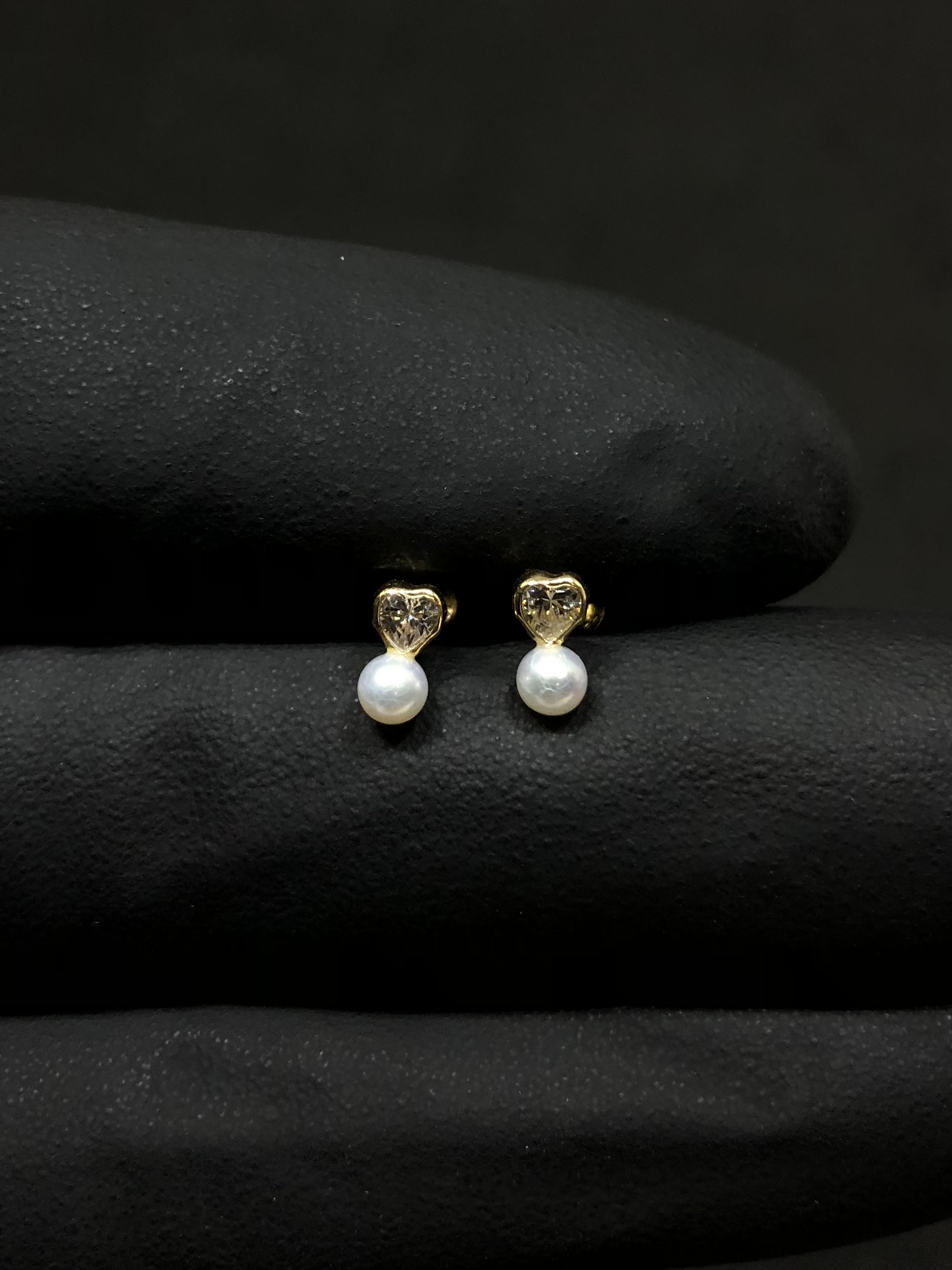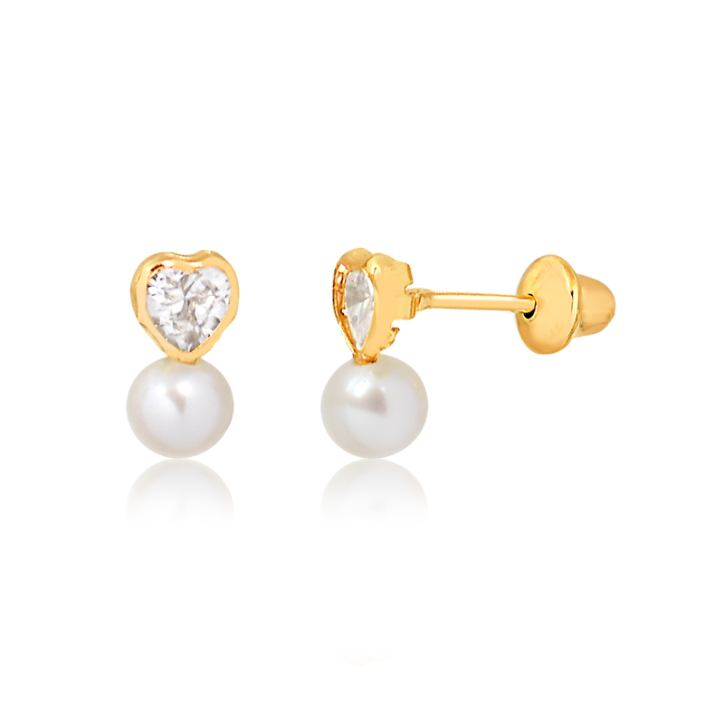 Brinco Ouro 18K Infantil | Coração | Pedra Zircônia Branca | Pérola