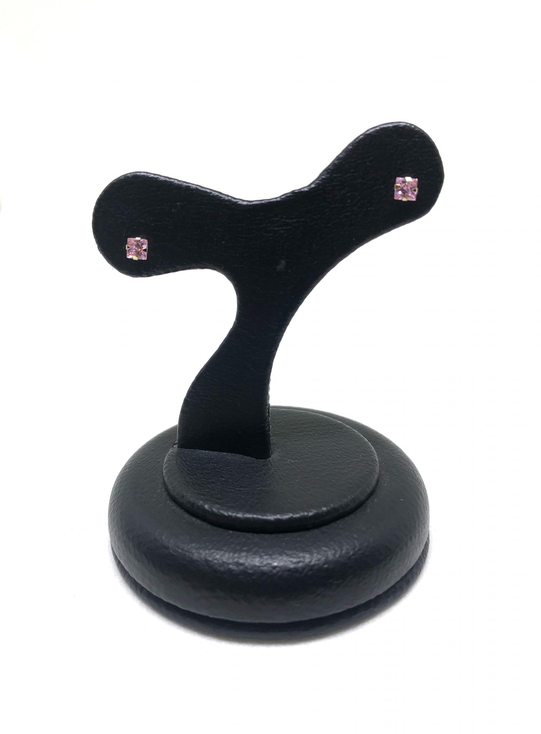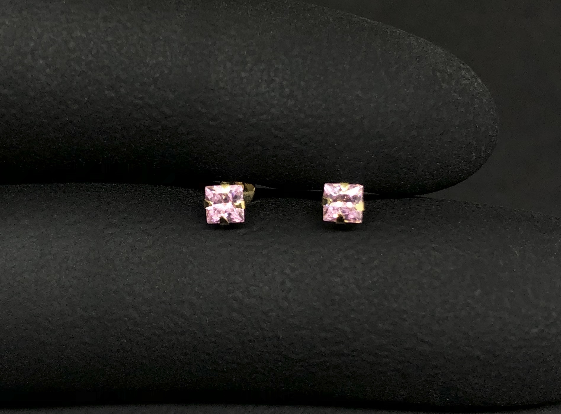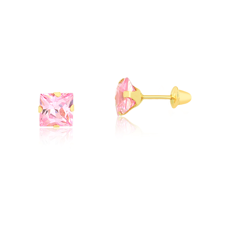 Brinco Ouro 18K Infantil | Pedra Quadrada Rosa